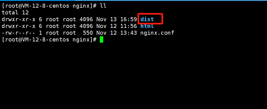 所以我们在root目录下新建nginx目录,并进入nginx目录下新建dist目录和一个nginx.conf配置文件。(可自行调整)