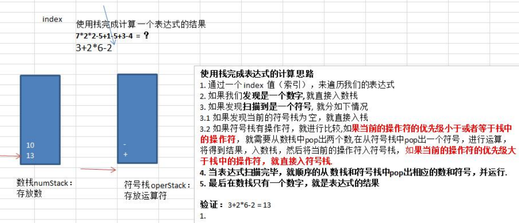 从右至左扫描表达式,遇到数字时,将数字压入堆栈,遇到运算符时,弹出栈顶的两个数,用运算符对它们做相应的计算(栈顶元素和次顶元素),并将结果入栈;重复上述过程指导表达式最左端,最后运算得出的值几位表达式的结果。